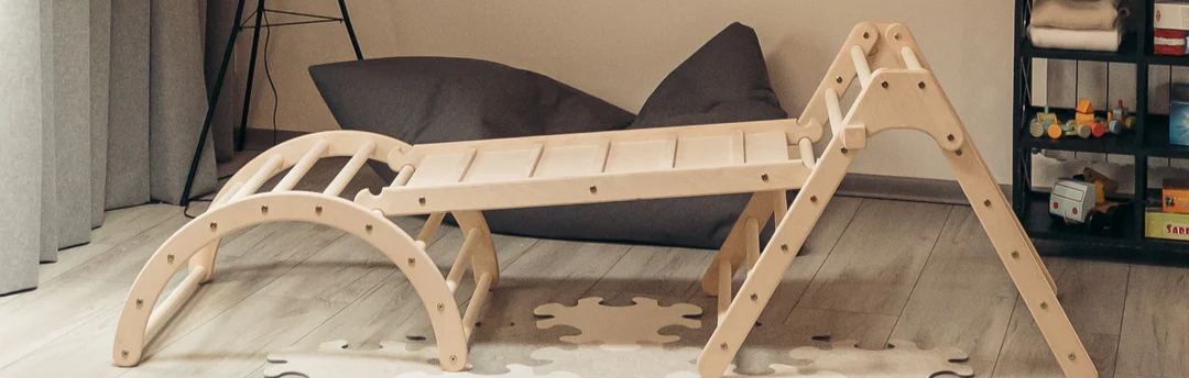 Die Kombination aus Montessori Kletterdreieck und Rutsche macht das Set zu einem vielseitigen Indoor-Spielgerät. Die Rutsche dient nicht nur dem Vergnügen, sondern auch als Balance- oder Kletterbrett – je nach Aufbau.