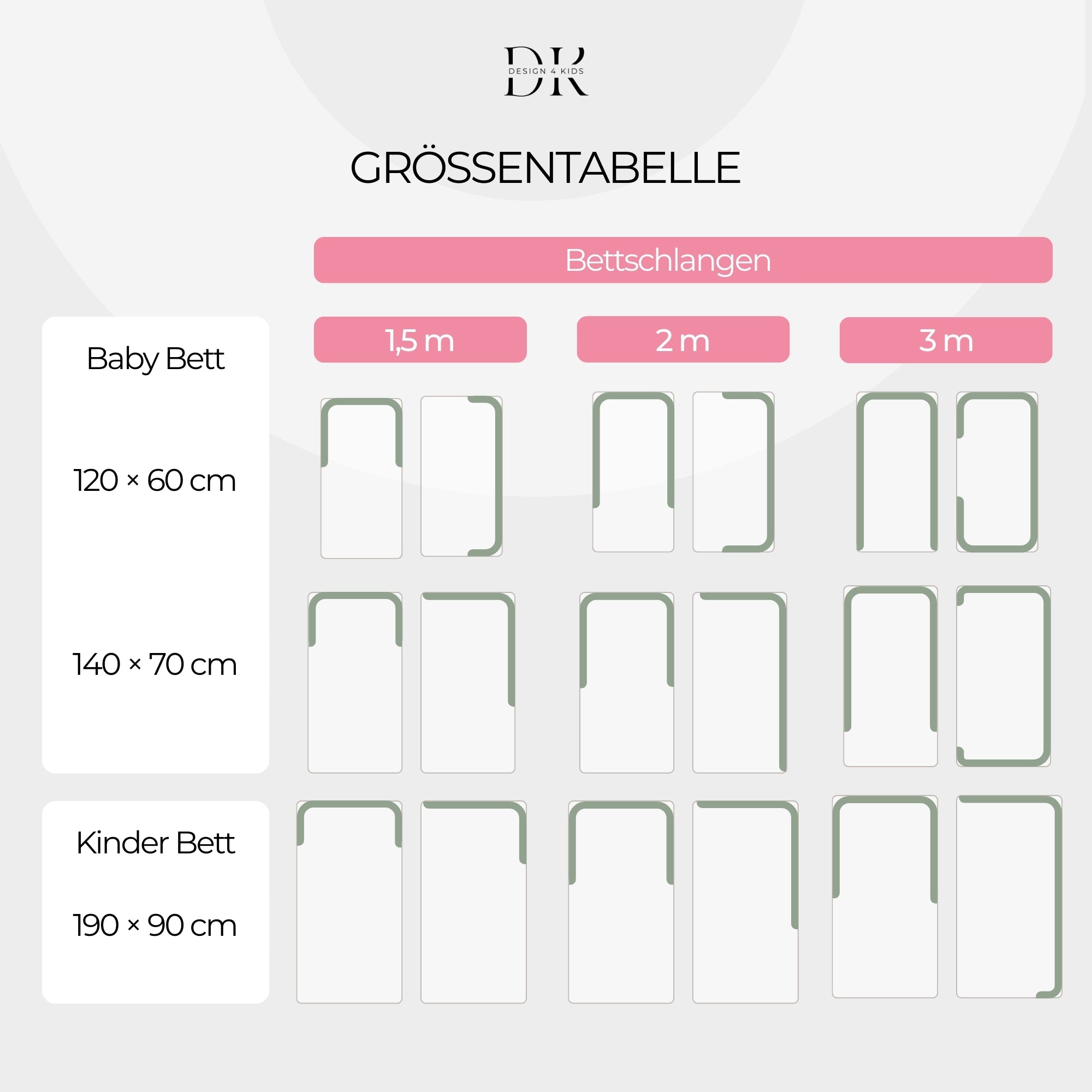 Ja – dank der wählbaren Längen (1,5 m, 2 m und 3 m) passt die Bettschlange sowohl an Standard-Babybetten (120×60 cm) als auch an größere Kinderbetten bis 190×90 cm. Unsere Größentabelle gibt Aufschluss darüber, wie welche Bettschlange, in verschiedenen Betten liegen kann.