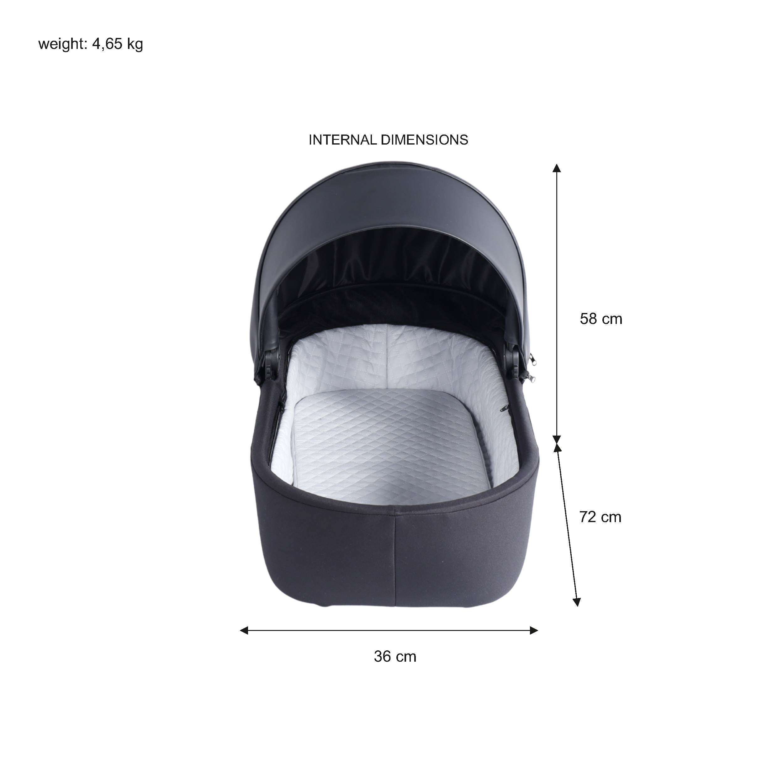 Der Noir wird als komplettes 2-in-1-Set geliefert: mit Babywanne, Sportsitz, Wickelrucksack, Einkaufskorb, Moskitonetz und Regenschutz – alles im eleganten Noir-Design.